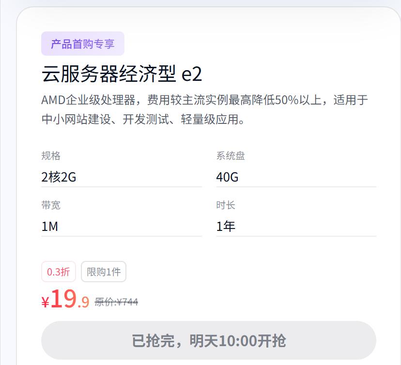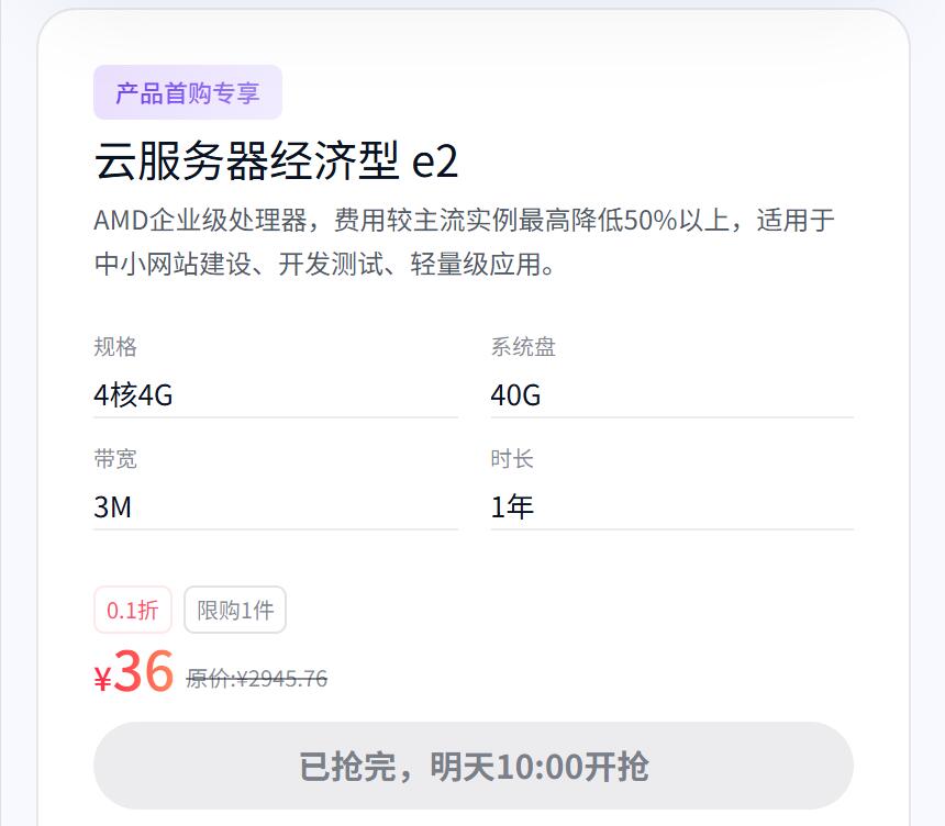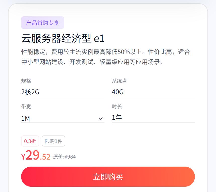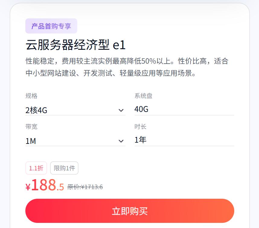 云服务器击穿底价:1 核 2G 轻量应用服务器首购仅 48 元 / 年,预装应用型镜像,适配小型网站、电商测试等场景;1 核 1G 云服务器低至 58 元 / 年,40G 系统盘 + 1M 带宽满足博客、学习等基础需求,更有通用配置低至 98 元 / 年。