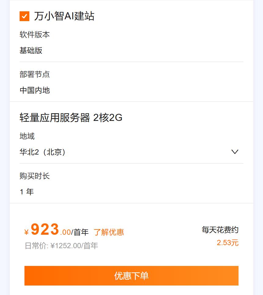 建站 / 办公:万小智 AI 建站基础版 450 元 / 年、标准版 980 元 / 年,零基础快速搭建企业官网;无影云电脑企业版(4 核 8G,120 小时 / 月)199 元 / 年,远程办公无压力。