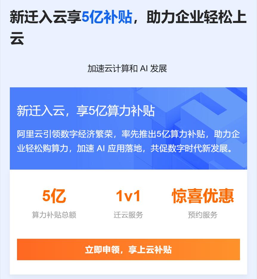 大型企业 / 出海业务:高性能 ECS+GPU 算力特惠,叠加迁云补贴、出海扶持,保障高并发、跨境业务稳定运行。