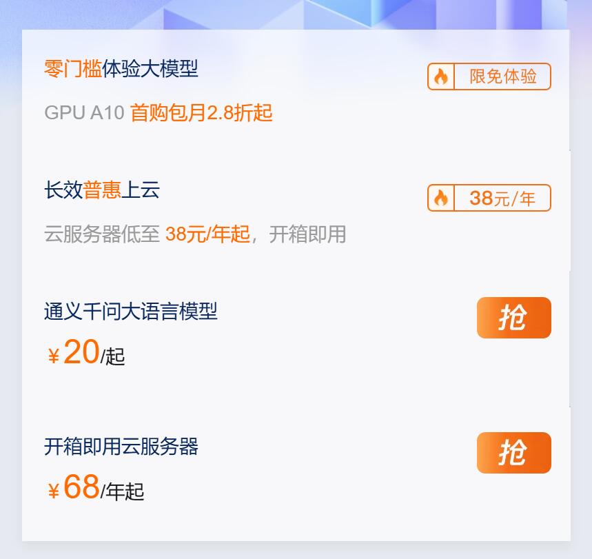 算力超值购:GPU 新客特惠来袭,A10 等卡型前 100 小时低至 0.9 折,月付 2.8 折起;L20(96G 显存)联系顾问享神秘折扣,AI 平台 PAI 通用节省计划低至 3 折,覆盖模型训练、推理全流程。