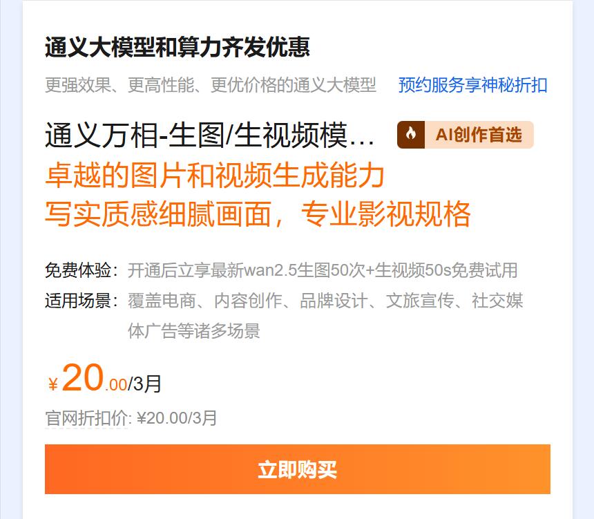 内容创作补贴:AI 生图 0.2 元 / 张(100 张仅 20 元),wan2.5 视频生成模型 0.3 元 / 秒(66 秒仅 20 元),助力短视频、营销素材高效产出。