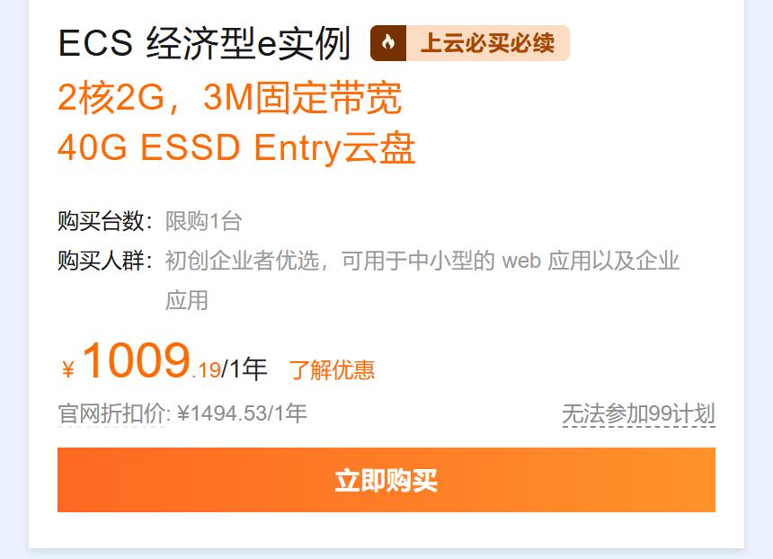 ECS 云服务器:经济型 e 实例 2 核 2G、3M 固定带宽,新老同享 99 元 / 年,续费同价;企业专享 u1 实例 2 核 4G、5M 带宽,199 元 / 年起,满足 Web 前端、计算密集型业务需求。
