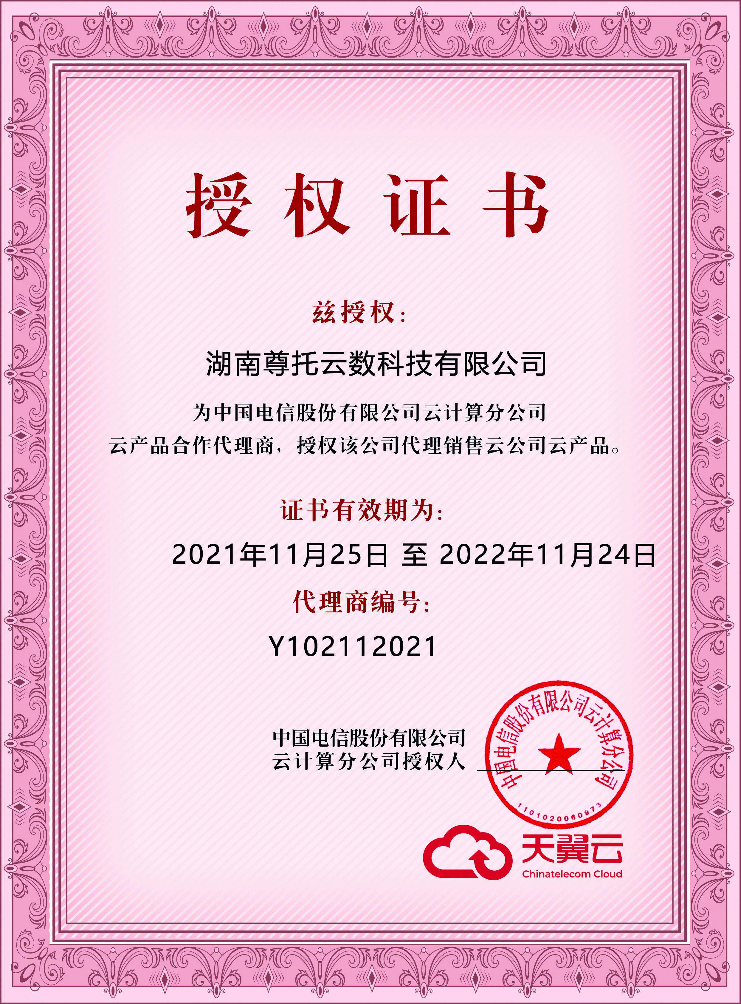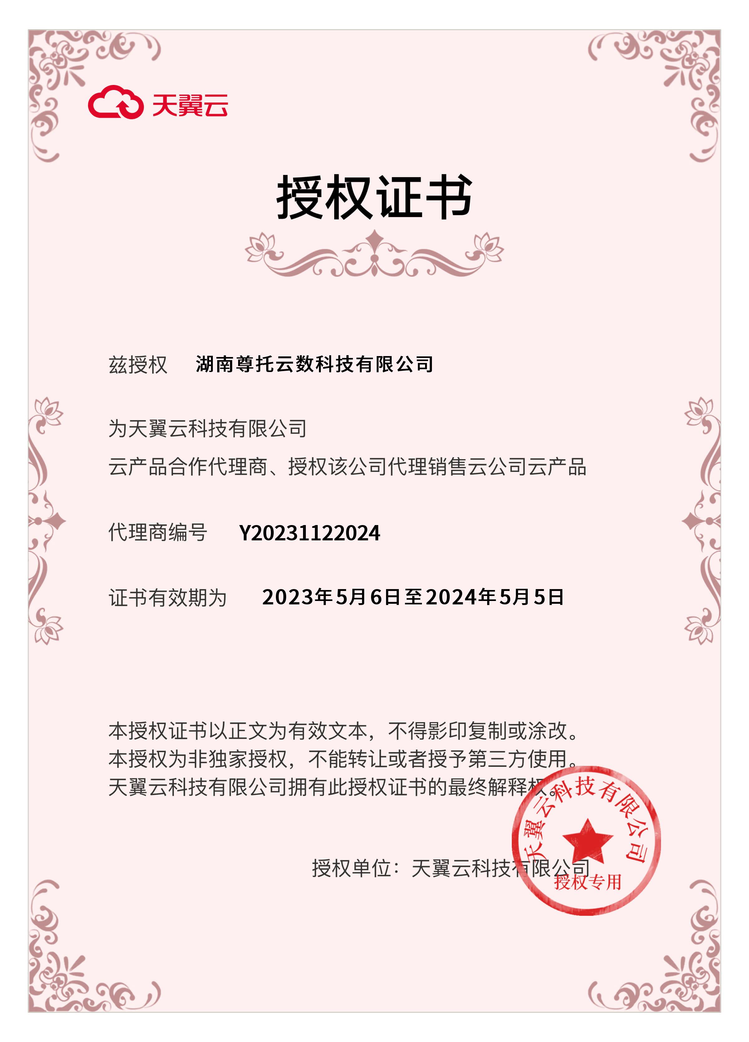 天翼云授权销售证书